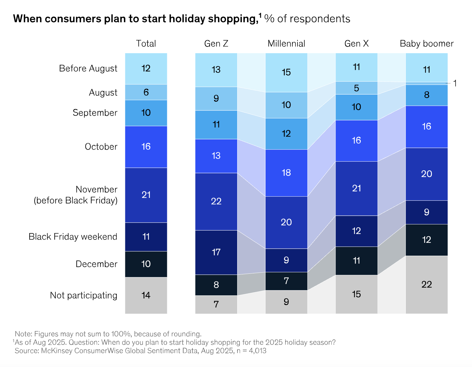 Generational divides are essential to consider this holiday season. 37% of millennials start shopping before October, while Gen Z is both driving AI adoption and fueling the mall revival. Meanwhile, 22% of boomers say they won’t participate at all.