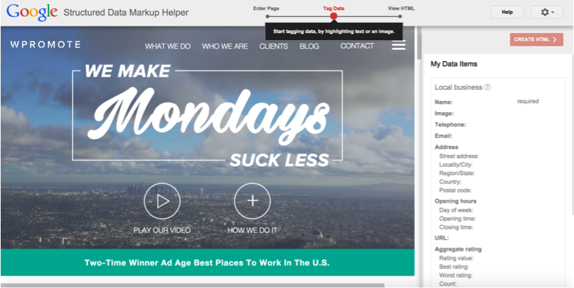 From here you can just start tagging various elements of the page, such as an Event’s location or a Product’s price. Just highlight the data on the page, choose what it represents, and then the tool will generate the code. Once you’ve finished marking up the page hit ‘Create HTML’ and you’ll be done! You can then just paste the generated code onto your website’s HTML and the page will be marked up.