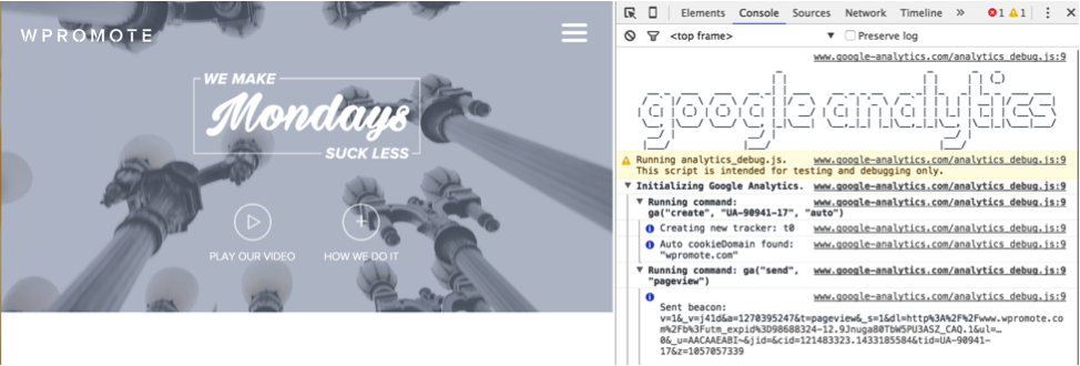 The last tool we will go over in this blog post is the Google Analytics Debugger. Like the Tag Assistant, this is a Chrome Extension, but the debugger instead displays the debug version of the GA JavaScript for the page you are currently on. To actually see the JavaScript you’ll need to open the Chrome JavaScript console (control-shift-j for Windows/Linux, command-option-j for Mac). You will then see a log of the analytics code on the page, including any issues the debugger is detecting. Very simple to use, and it can help identify potential issues on your site.