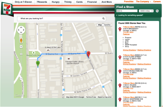7-Eleven uses a form to help you find a store. However, all the information including address, phone number, and directions populates within the form window. You are unable to navigate to a particular page with this information without re-submitting to the form.