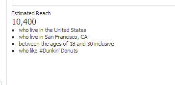 The above ad would be a likely audience for our San Francisco donut shop ad campaign we discussed earlier in this article. It is targeting people who like Dunkin Donuts (so we know they probably like donuts) and are located in the San Francisco area. I would prefer an even smaller audience (closer to 5,000), but this audience size is worth a test. This advertiser could target by zip code to narrow the audience further.