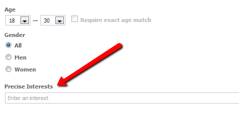 Use the “Precise Interests” field to target the people who would likely respond to your ad. Be specific and don’t worry about targeting a “smaller” number of people (see next point).